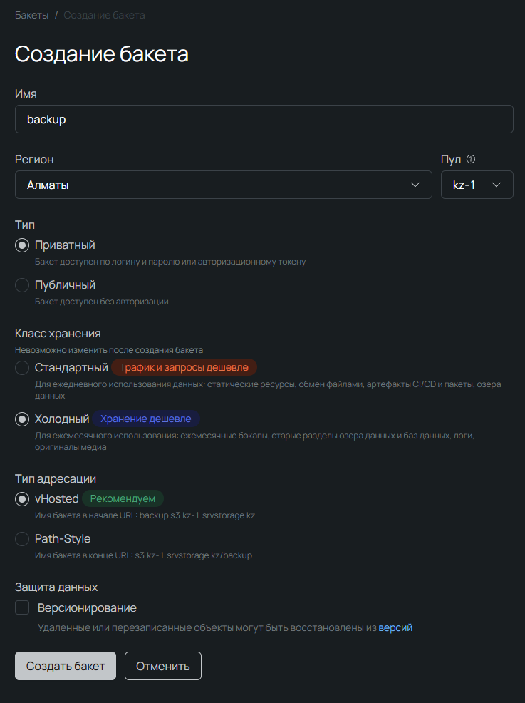 vHosted. При таком типе имя вашего бакета становится частью URL (например,my-backup.s3.kz-1.srvstorage.kz). Это современный стандарт, который рекомендует Selectel и который лучше всего понимает ispmanager.